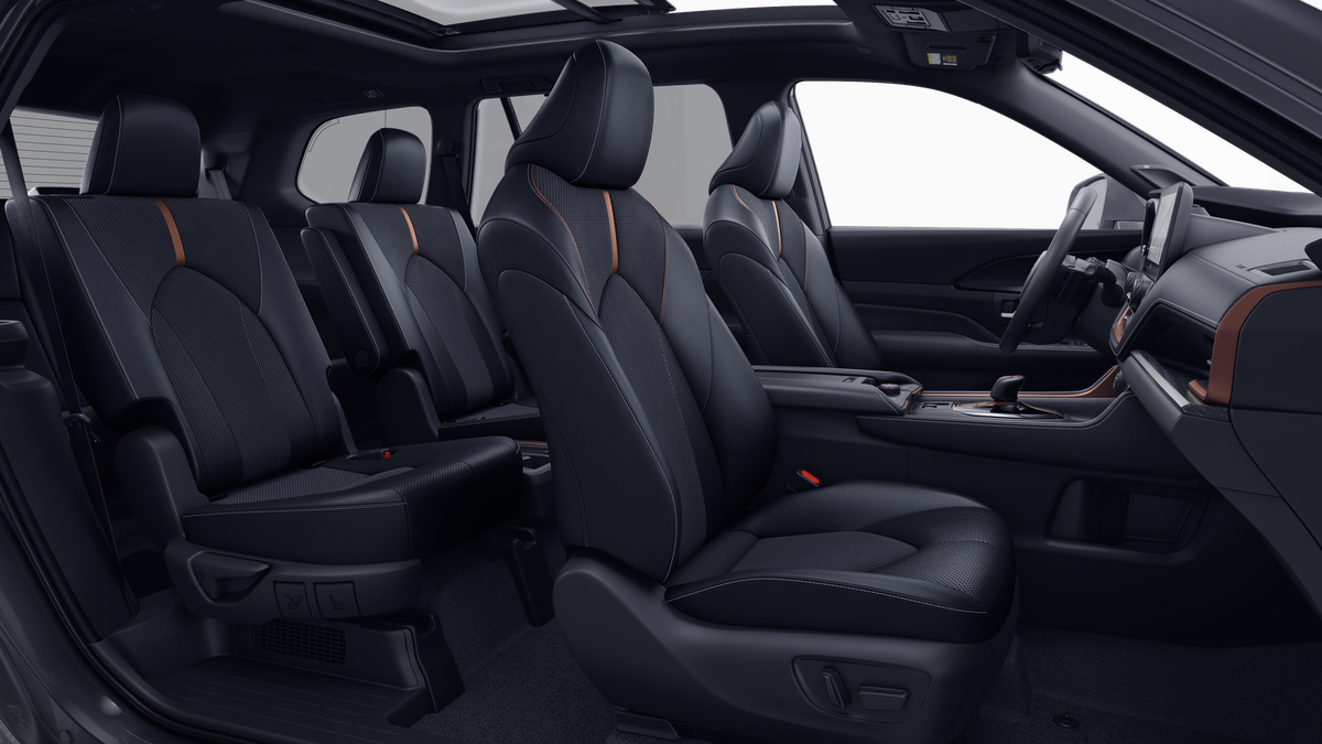 • 7-passenger seating with second-row fold-down captain's chairs and fold-down inboard armrests, adjustable headrests and two cup holders mounted on the floor; and 60/40 split, fold-down third-row seats with sliding headrests and recline function
